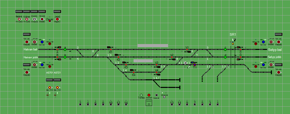 | Biztosító- és jelzőberendezések: | Kép letöltése A TerVez2 Vasútforgalmi Szimulátorban megvalósított állomások eltéréseket mutathatnak a valós állomáshoz képest. |