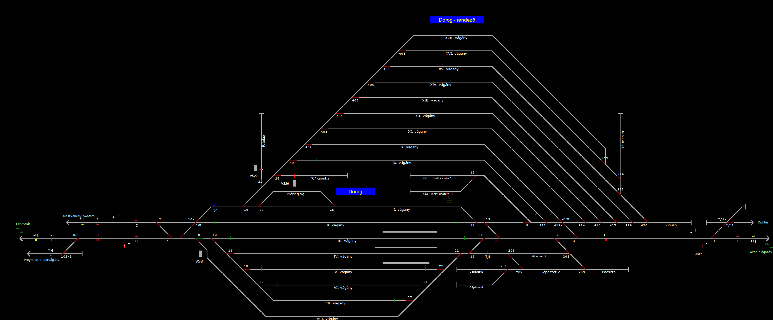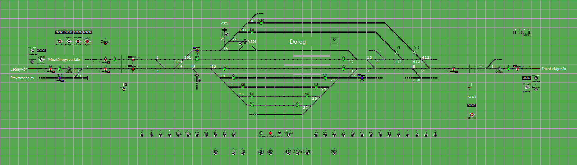 | Biztosító- és jelzőberendezések: | Kép letöltése A TerVez2 Vasútforgalmi Szimulátorban megvalósított állomások eltéréseket mutathatnak a valós állomáshoz képest. |