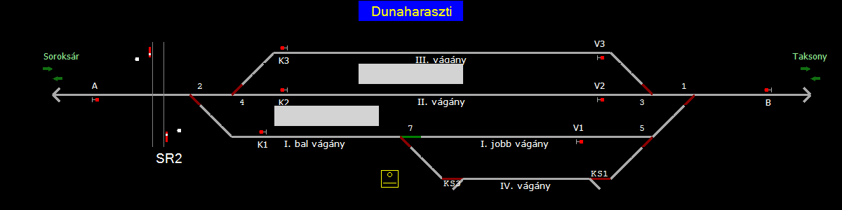| Biztosító- és jelzőberendezések: | Kép letöltése A TerVez2 Vasútforgalmi Szimulátorban megvalósított állomások eltéréseket mutathatnak a valós állomáshoz képest. |