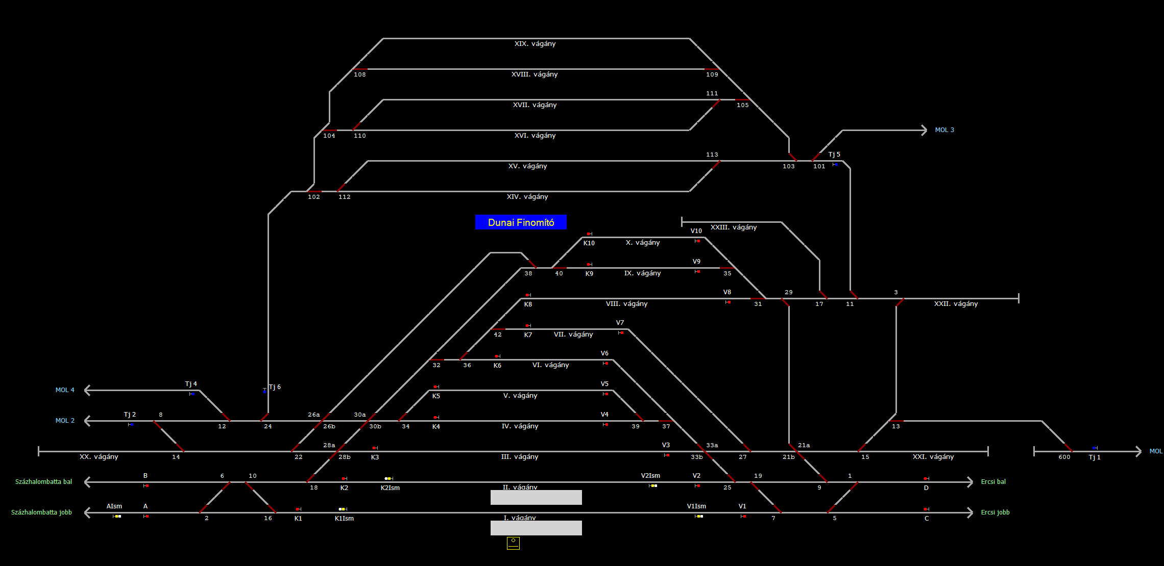 | Biztosító- és jelzőberendezések: | Kép letöltése A TerVez2 Vasútforgalmi Szimulátorban megvalósított állomások eltéréseket mutathatnak a valós állomáshoz képest. |