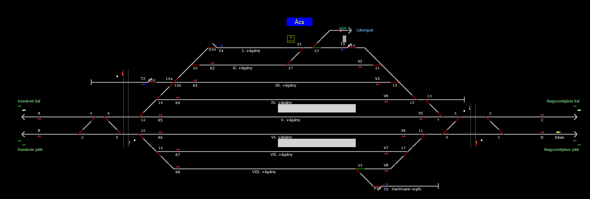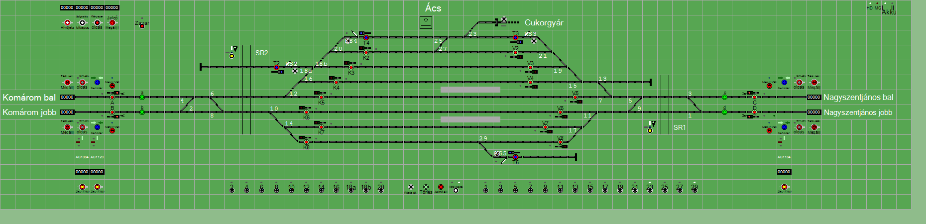 | Biztosító- és jelzőberendezések: | Kép letöltése A TerVez2 Vasútforgalmi Szimulátorban megvalósított állomások eltéréseket mutathatnak a valós állomáshoz képest. |