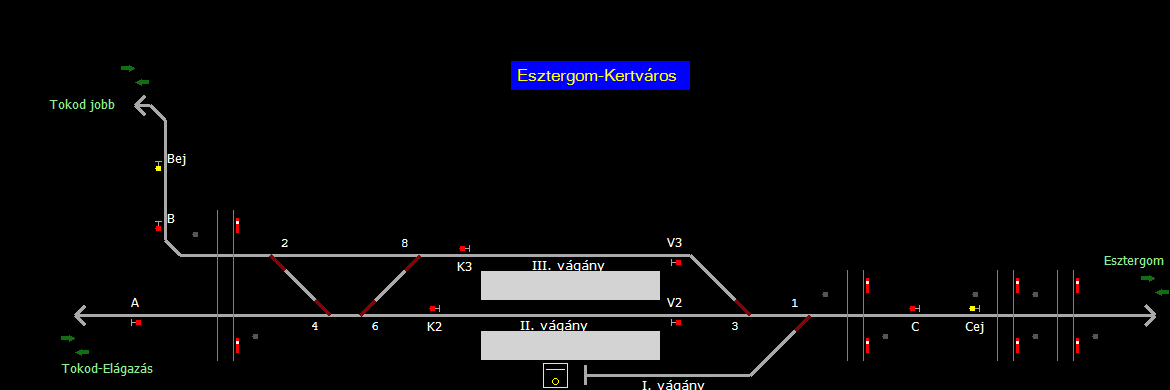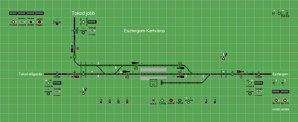 | Biztosító- és jelzőberendezések: | Kép letöltése A TerVez2 Vasútforgalmi Szimulátorban megvalósított állomások eltéréseket mutathatnak a valós állomáshoz képest. |