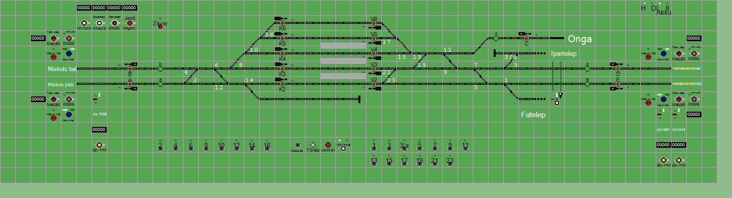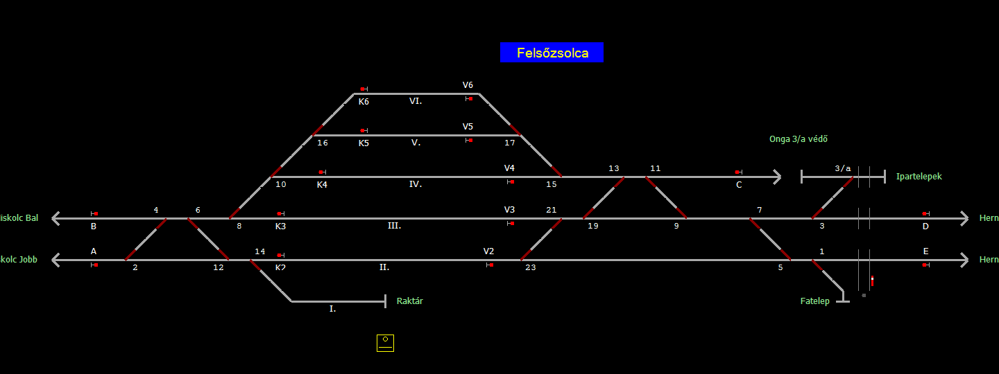 | Biztosító- és jelzőberendezések: | Kép letöltése A TerVez2 Vasútforgalmi Szimulátorban megvalósított állomások eltéréseket mutathatnak a valós állomáshoz képest. |