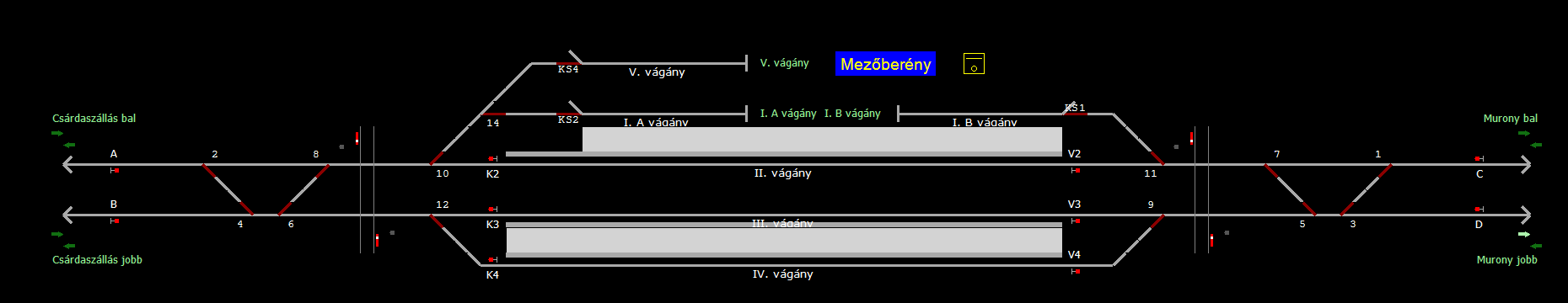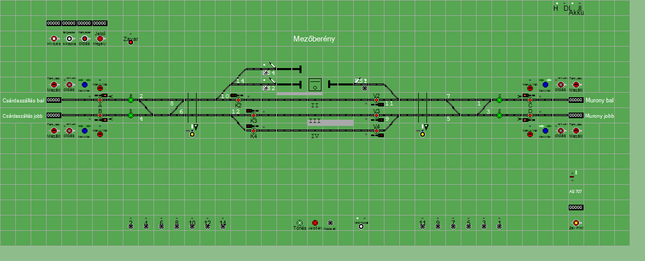 | Biztosító- és jelzőberendezések: | Kép letöltése A TerVez2 Vasútforgalmi Szimulátorban megvalósított állomások eltéréseket mutathatnak a valós állomáshoz képest. |