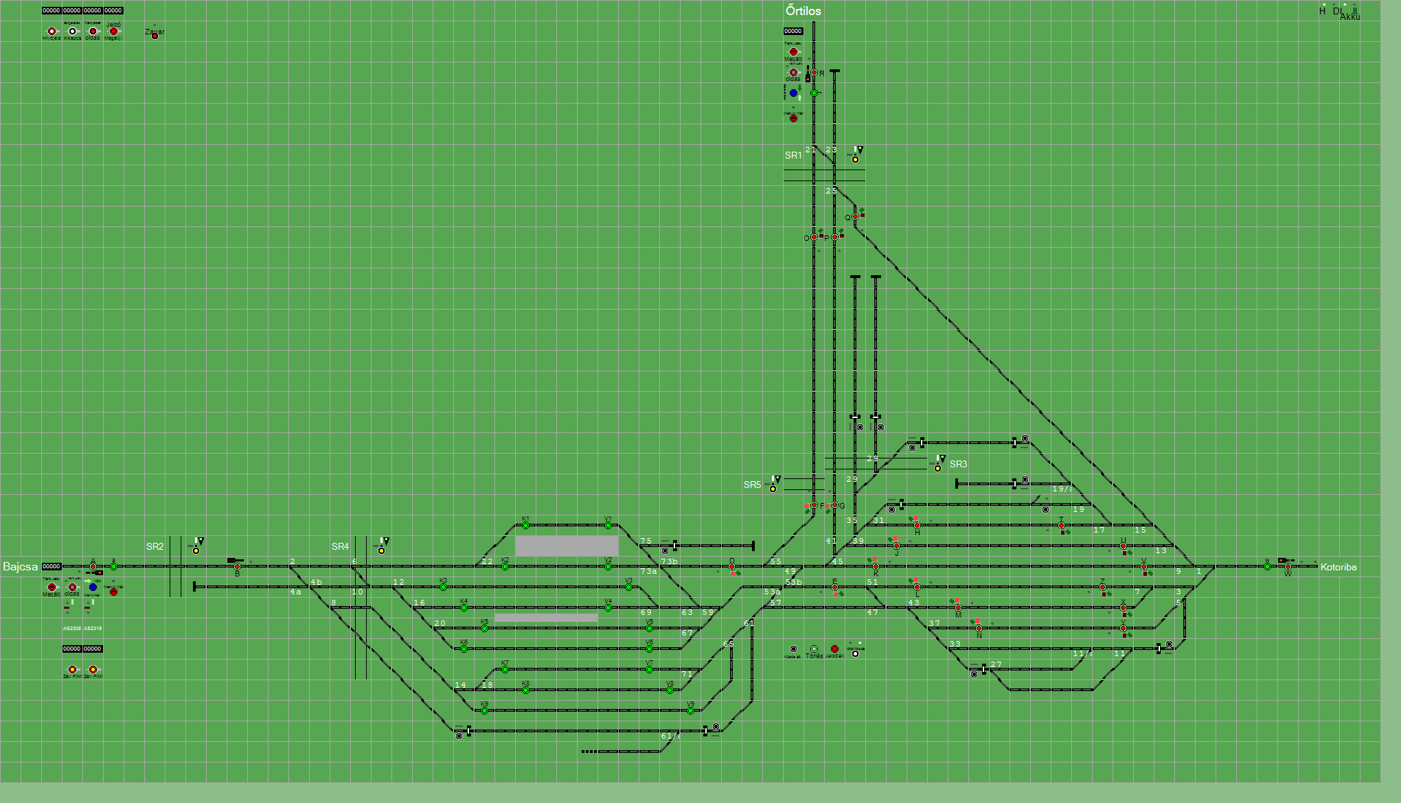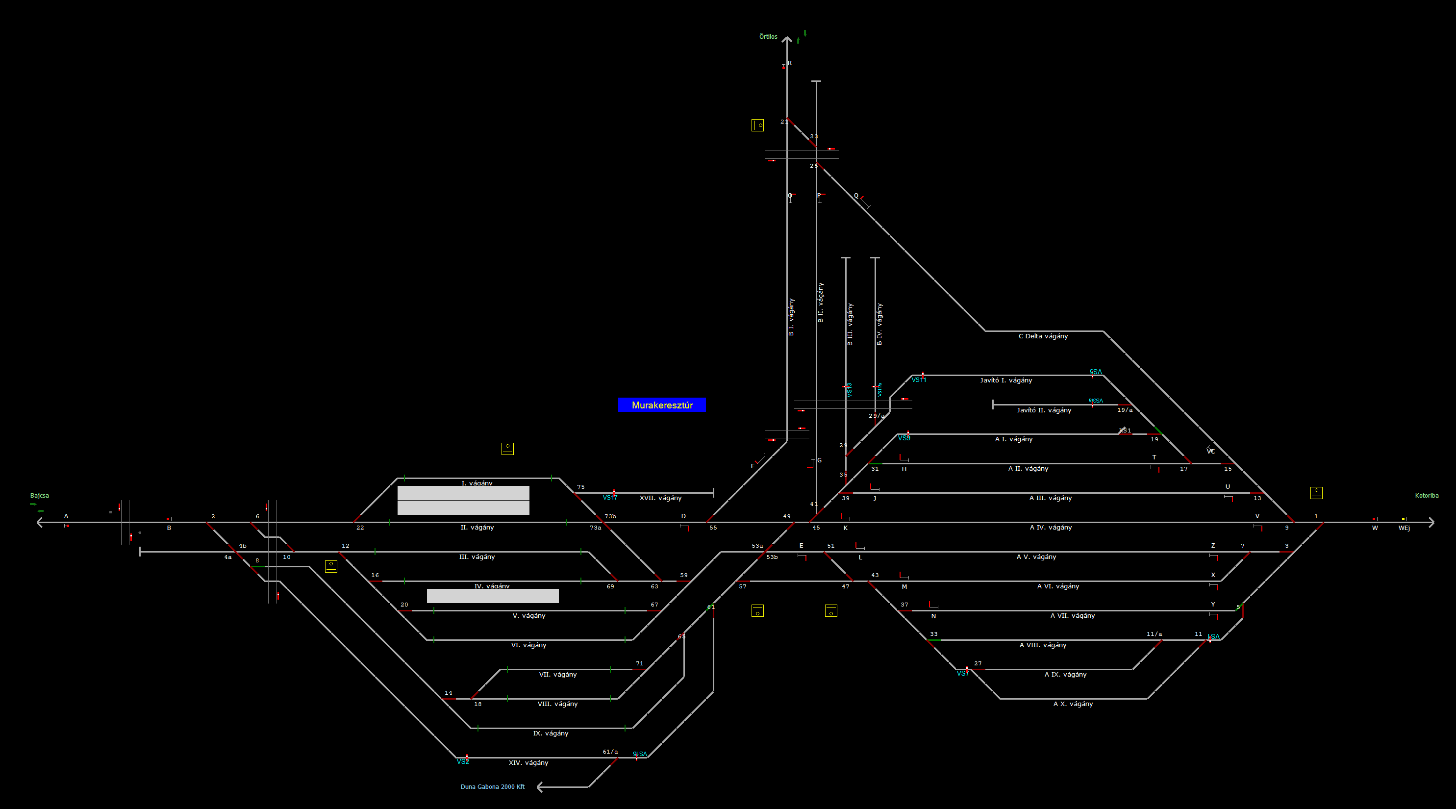 | Biztosító- és jelzőberendezések: | Kép letöltése A TerVez2 Vasútforgalmi Szimulátorban megvalósított állomások eltéréseket mutathatnak a valós állomáshoz képest. |