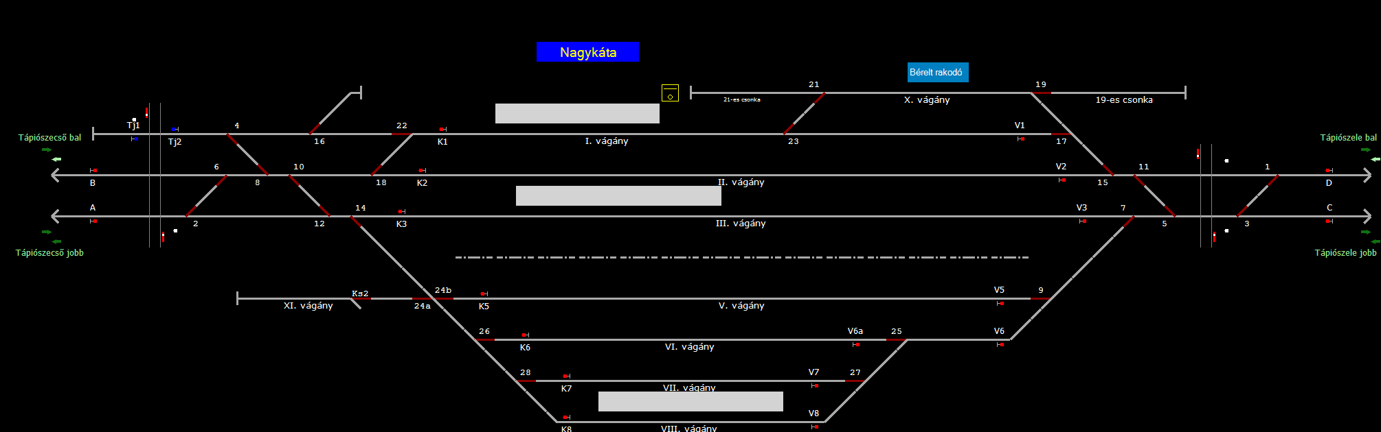 | Biztosító- és jelzőberendezések: | Kép letöltése A TerVez2 Vasútforgalmi Szimulátorban megvalósított állomások eltéréseket mutathatnak a valós állomáshoz képest. |