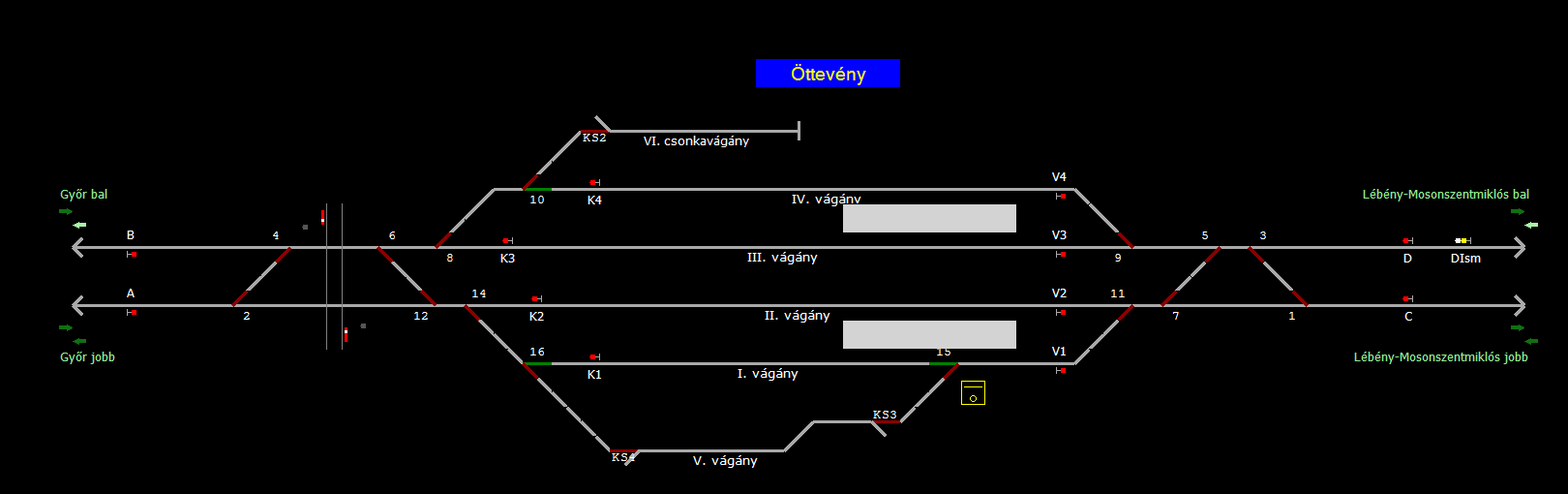 | Biztosító- és jelzőberendezések: | Kép letöltése A TerVez2 Vasútforgalmi Szimulátorban megvalósított állomások eltéréseket mutathatnak a valós állomáshoz képest. |