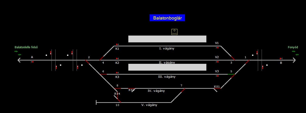 | Biztosító- és jelzőberendezések: | Kép letöltése A TerVez2 Vasútforgalmi Szimulátorban megvalósított állomások eltéréseket mutathatnak a valós állomáshoz képest. |