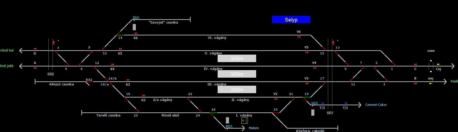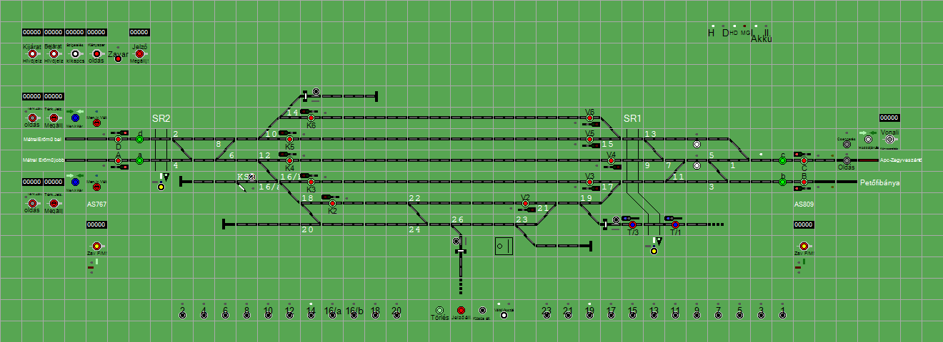 | Biztosító- és jelzőberendezések: | Kép letöltése A TerVez2 Vasútforgalmi Szimulátorban megvalósított állomások eltéréseket mutathatnak a valós állomáshoz képest. |