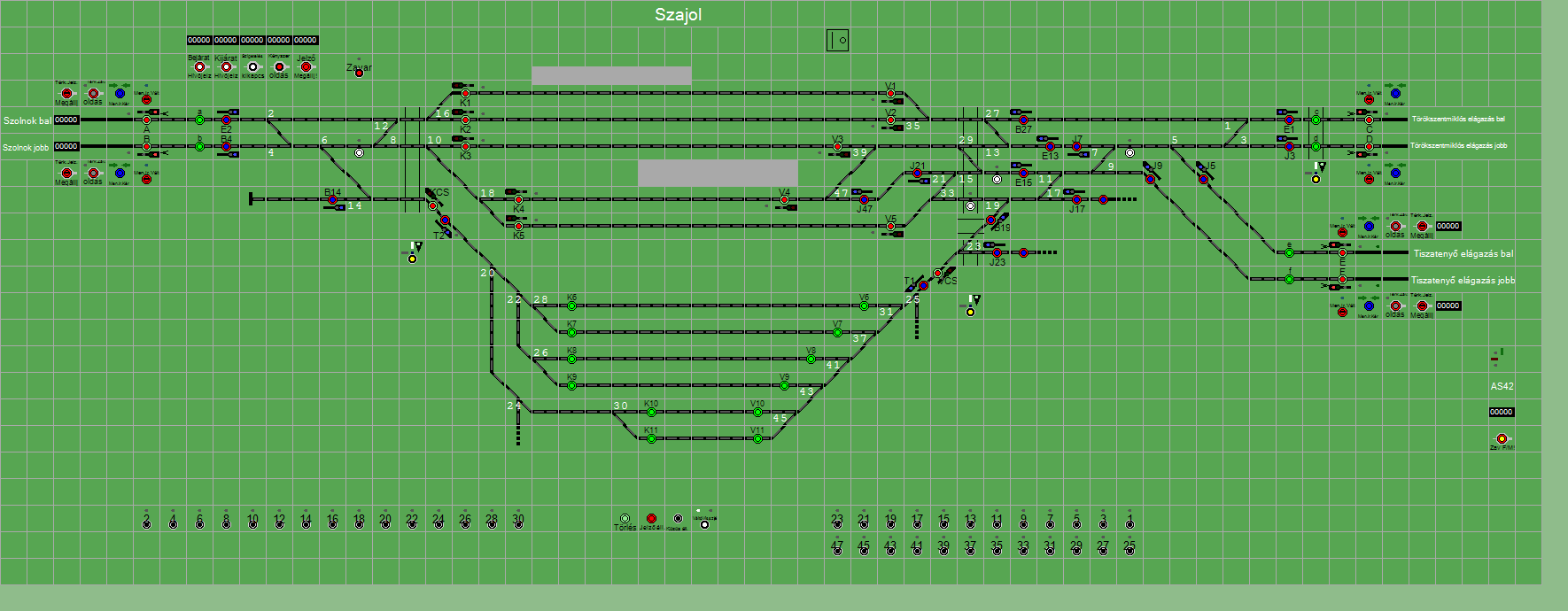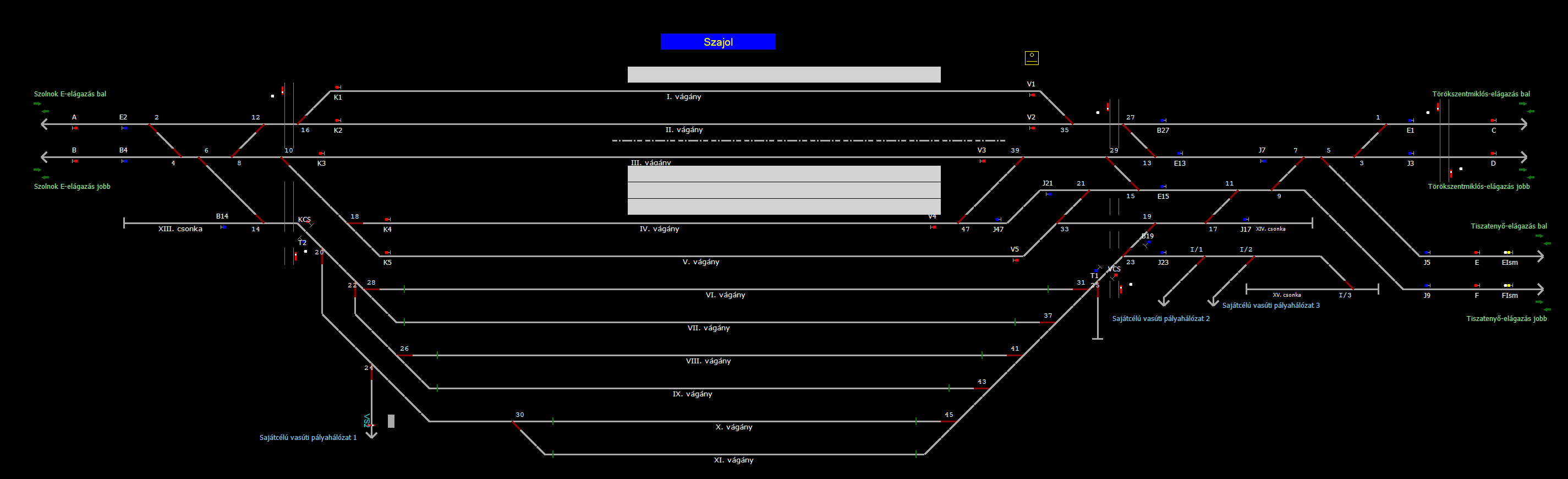 | Biztosító- és jelzőberendezések: | Kép letöltése A TerVez2 Vasútforgalmi Szimulátorban megvalósított állomások eltéréseket mutathatnak a valós állomáshoz képest. |