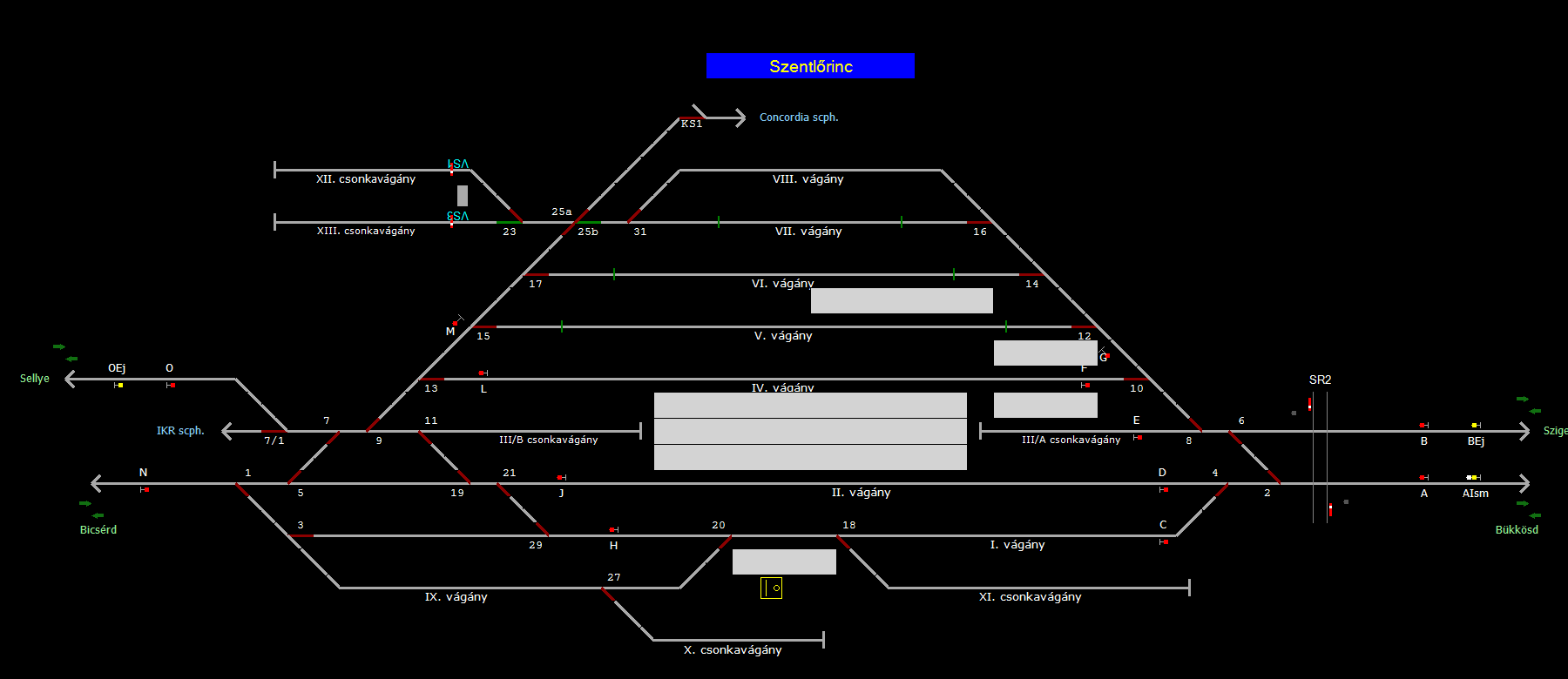 | Biztosító- és jelzőberendezések: | Kép letöltése A TerVez2 Vasútforgalmi Szimulátorban megvalósított állomások eltéréseket mutathatnak a valós állomáshoz képest. |