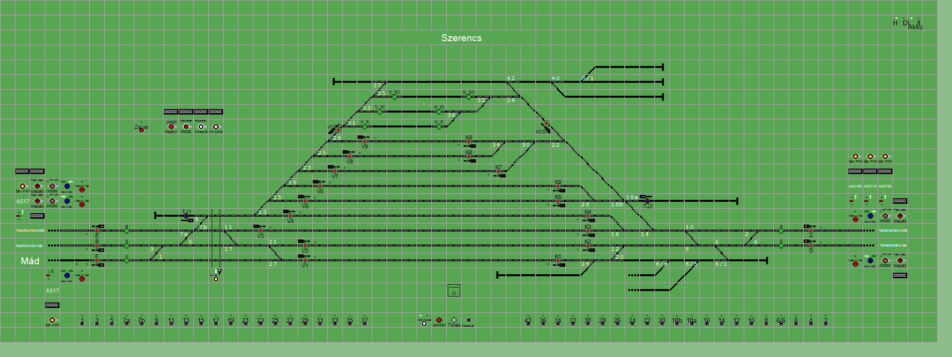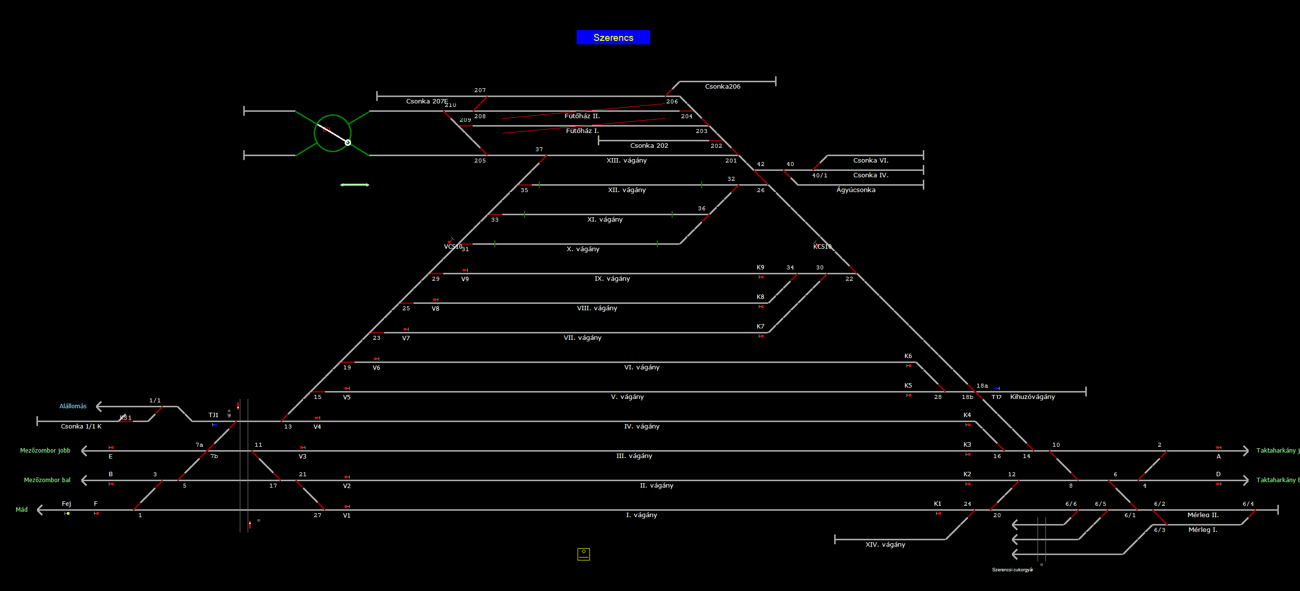 | Biztosító- és jelzőberendezések: | Kép letöltése A TerVez2 Vasútforgalmi Szimulátorban megvalósított állomások eltéréseket mutathatnak a valós állomáshoz képest. |
