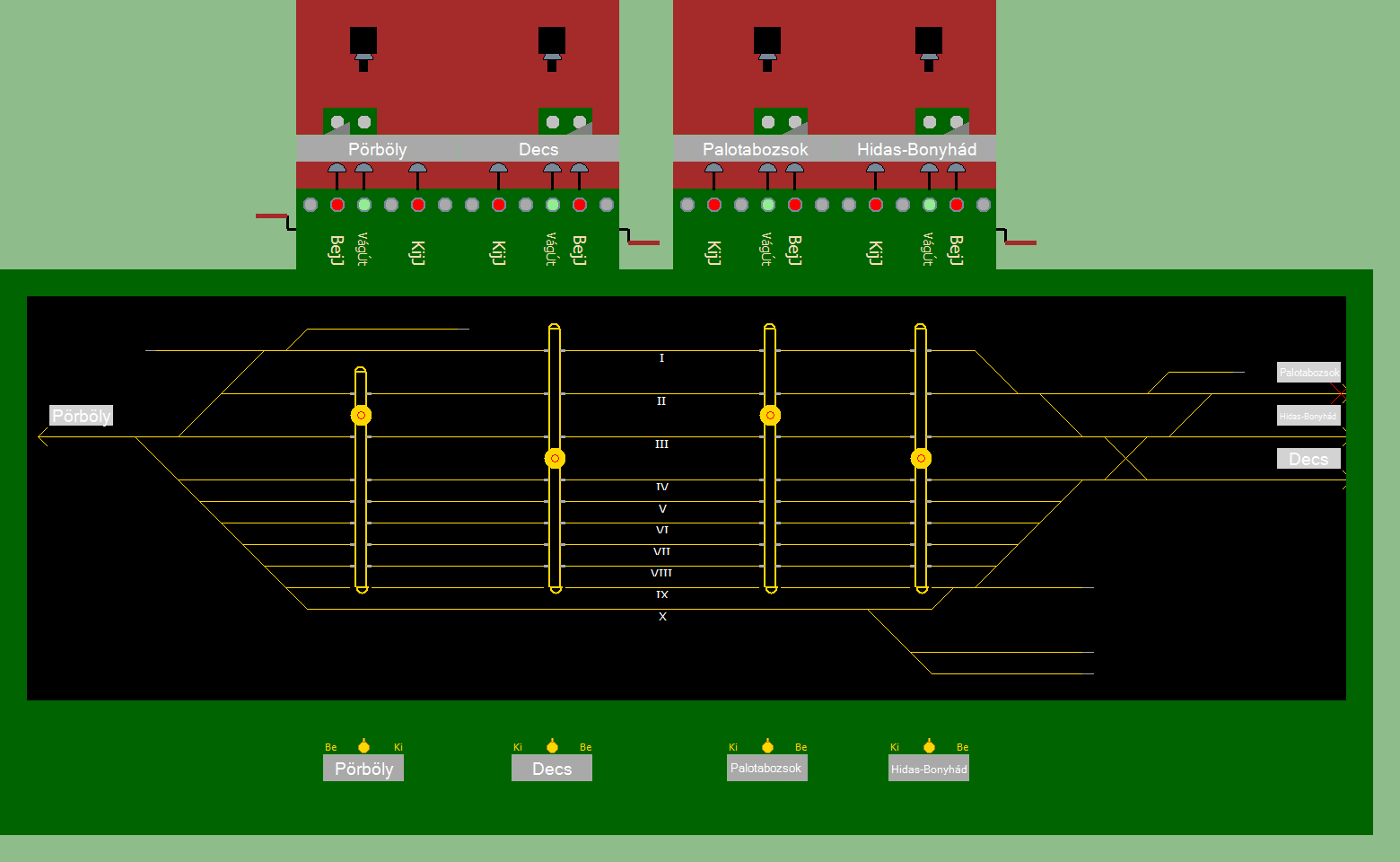 | Biztosító- és jelzőberendezések: | Kép letöltése Kép letöltése Kép letöltése Kép letöltése Kép letöltése Kép letöltése A TerVez2 Vasútforgalmi Szimulátorban megvalósított állomások eltéréseket mutathatnak a valós állomáshoz képest. |