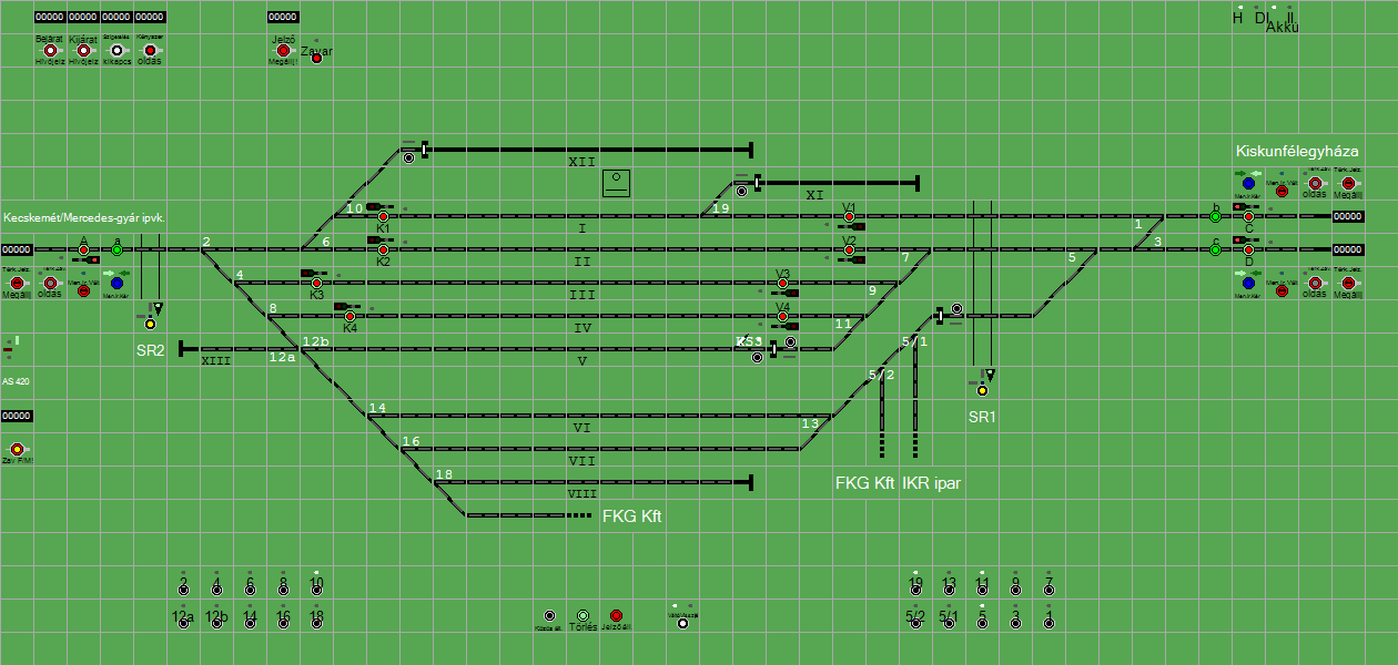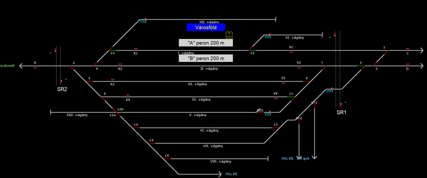 | Biztosító- és jelzőberendezések: | Kép letöltése A TerVez2 Vasútforgalmi Szimulátorban megvalósított állomások eltéréseket mutathatnak a valós állomáshoz képest. |