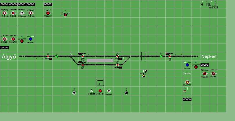 | Biztosító- és jelzőberendezések: | Kép letöltése A TerVez2 Vasútforgalmi Szimulátorban megvalósított állomások eltéréseket mutathatnak a valós állomáshoz képest. |
